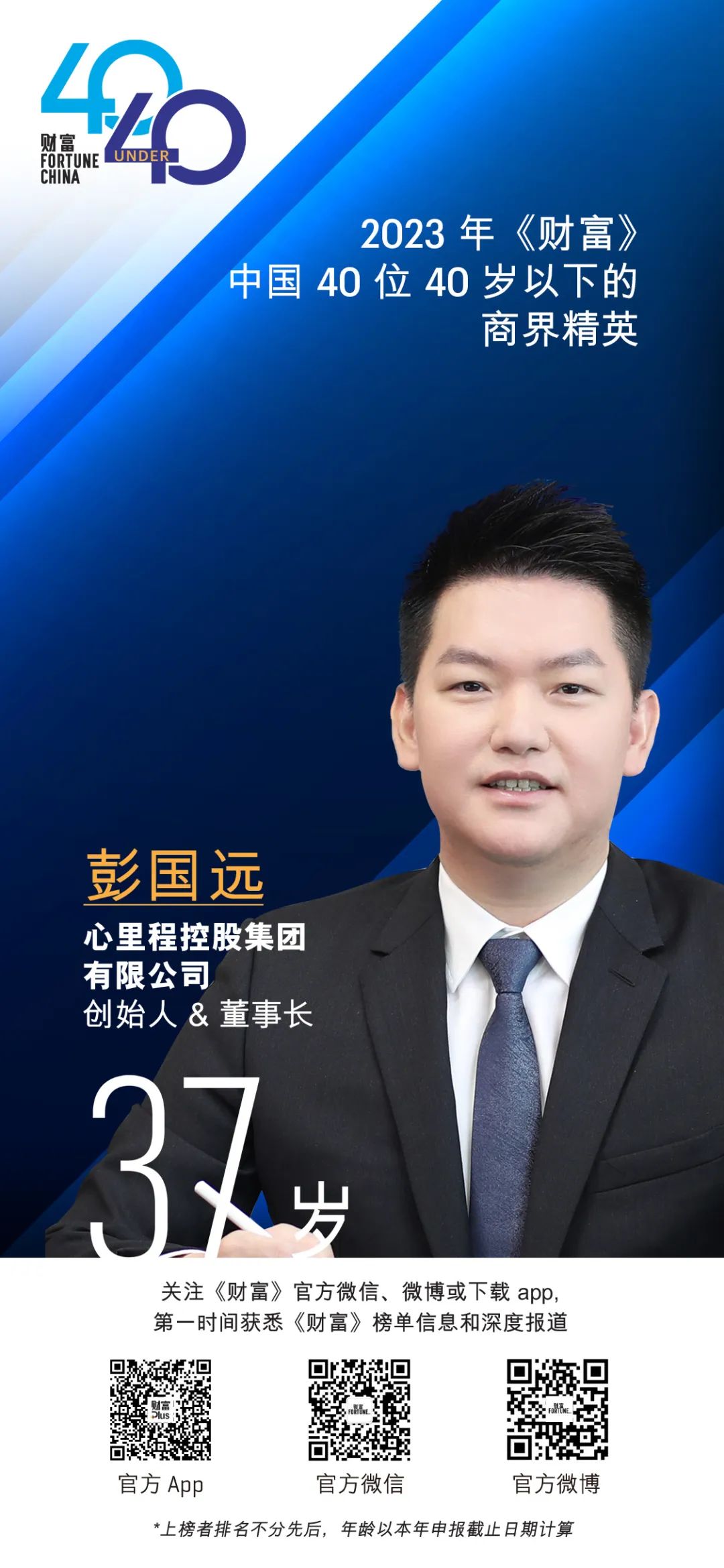 彭國遠董事長表示,非常感謝《財富》媒體集團的鼓勵和厚愛,本人獲得“中國40位40歲以下的商界精英”榮譽,而本人帶領(lǐng)的心里程集團也上榜《財富》中國500強第245位,這對個人和集團來說,既是認可,也是鼓勵,未來將不斷注重技術(shù)迭代和商業(yè)模式的創(chuàng)新,通過核心競爭力的不斷提升,持續(xù)賦能中國經(jīng)濟社會發(fā)展。