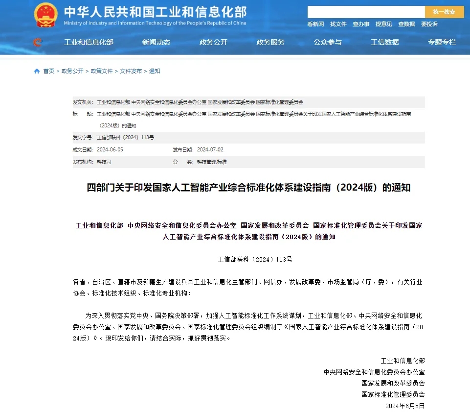近日,工業(yè)和信息化部、中央網(wǎng)信辦、國家發(fā)展改革委、國家標(biāo)準(zhǔn)委等四部門聯(lián)合印發(fā)《國家人工智能產(chǎn)業(yè)綜合標(biāo)準(zhǔn)化體系建設(shè)指南(2024版)》,進(jìn)一步加強(qiáng)人工智能標(biāo)準(zhǔn)化工作系統(tǒng)謀劃,加快構(gòu)建滿足人工智能產(chǎn)業(yè)高質(zhì)量發(fā)展和“人工智能+”高水平賦能需求的標(biāo)準(zhǔn)體系,夯實(shí)標(biāo)準(zhǔn)對推動(dòng)技術(shù)進(jìn)步、促進(jìn)企業(yè)發(fā)展、引領(lǐng)產(chǎn)業(yè)升級、保障產(chǎn)業(yè)安全的支撐作用,更好推進(jìn)人工智能賦能新型工業(yè)化。