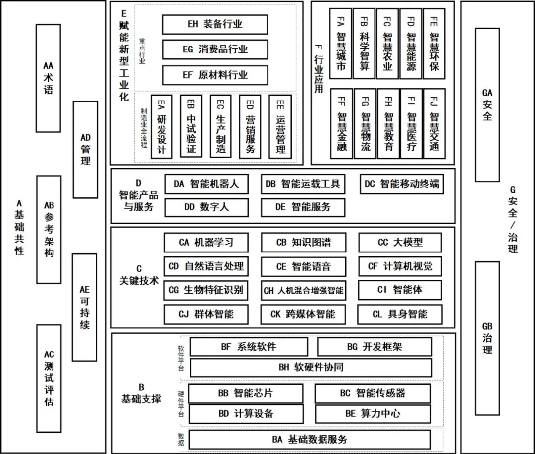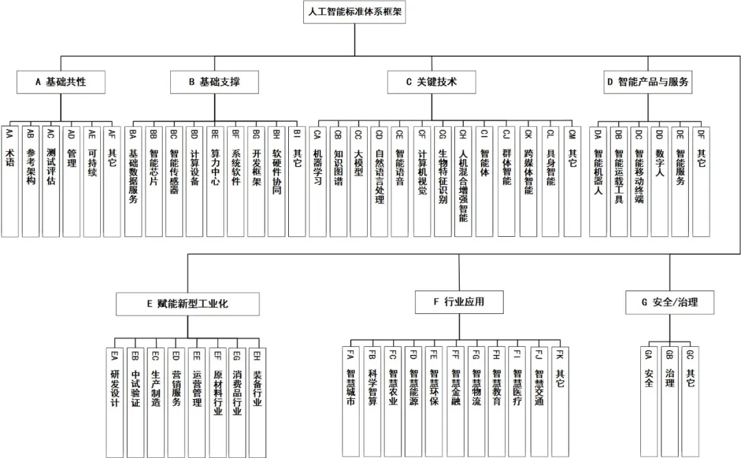 關(guān)鍵技術(shù)標(biāo)準(zhǔn)主要包括機(jī)器學(xué)習(xí)、知識圖譜、大模型、自然語言處理、智能語音、計(jì)算機(jī)視覺、生物特征識別、人機(jī)混合增強(qiáng)智能、智能體、群體智能、跨媒體智能、具身智能等標(biāo)準(zhǔn)。