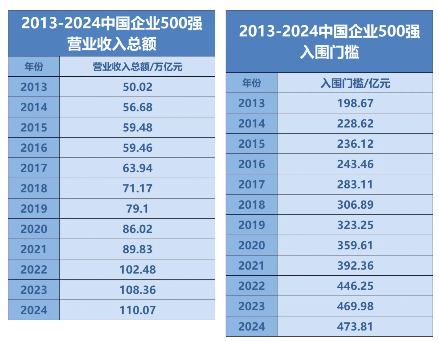 據悉,2024中國企業(yè)500強營業(yè)收入邁上新臺階,突破了110萬億元大關,達110.07萬億元,較上年相比增長1.58%。其入圍門檻達到473.81億元,提升3.83億元,實現(xiàn)22連升。
